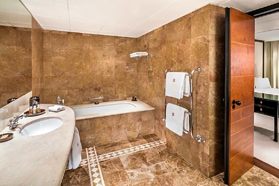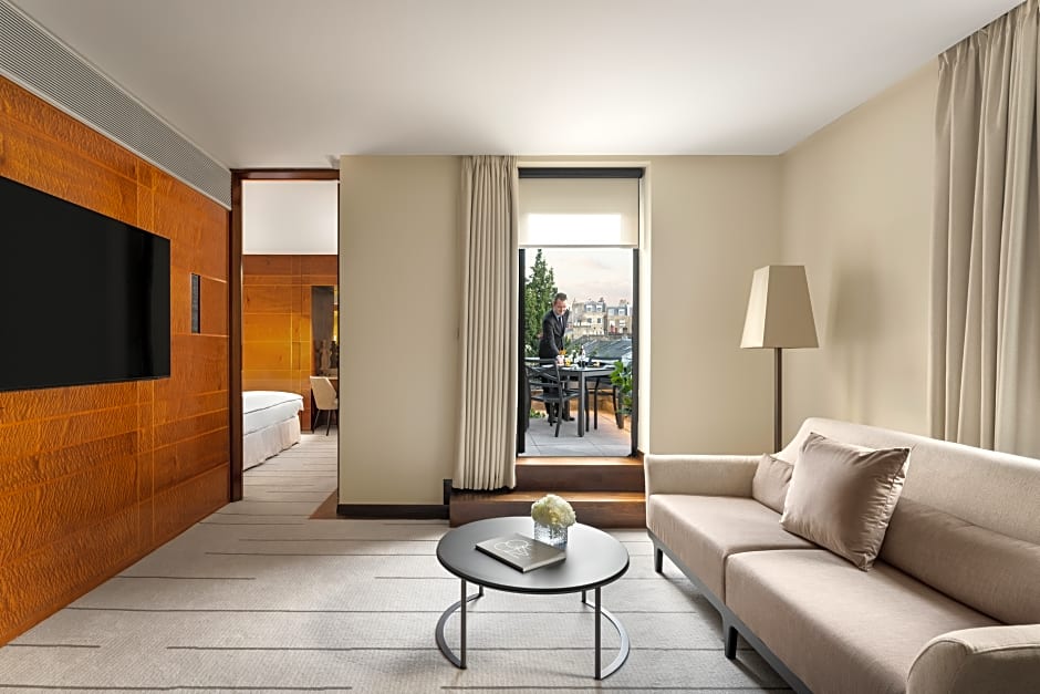 A spacious suite with a relaxing sitting area, king-size bed and marble bathroom.